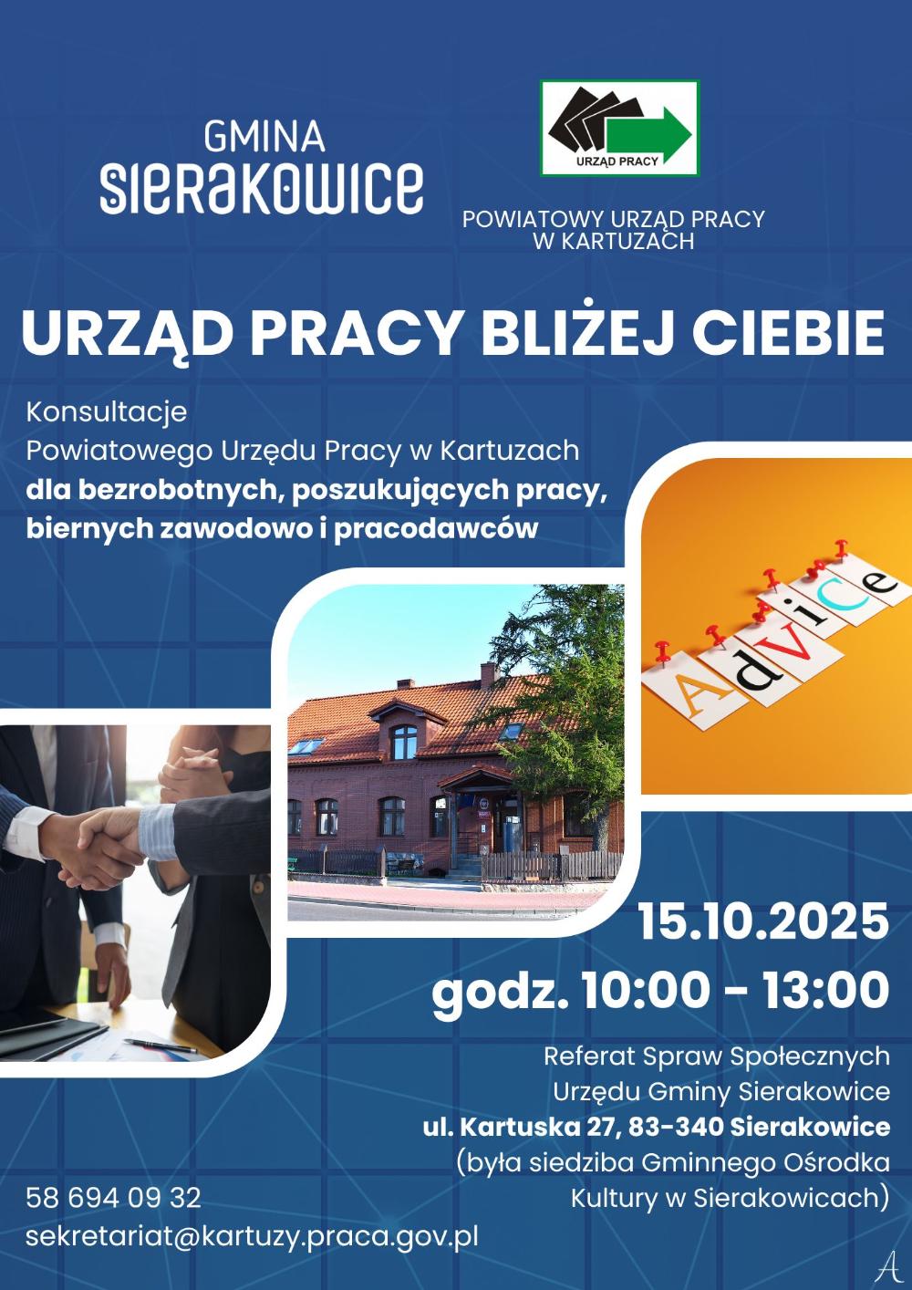 15 października pracownicy Powiatowego Urzędu Pracy w Kartuzach dyżurowali na wyjeździe – w Urzędzie Gminy w Sierakowicach. Była to okazja do rozmów na temat możliwości zatrudnienia, dostępnych form wsparcia oraz sposobów podnoszenia kwalifikacji zawodowych. Podczas wydarzenia do dyspozycji uczestników był również doradca zawodowy, który udzielał praktycznych wskazówek dotyczących przygotowania dokumentów aplikacyjnych oraz utrzymania stabilnego zatrudnienia.